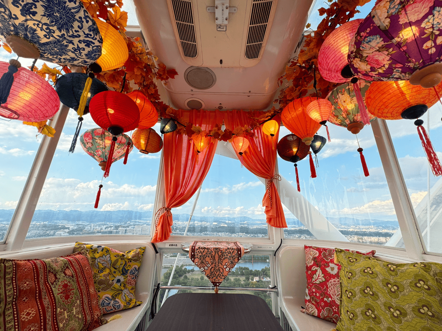 2025年秋のそらカフェ観覧車は、ランタンの装飾で彩られた特別なゴンドラに乗り込み、幻想的な空間でゆったりカフェ気分をお楽しみいただけます。